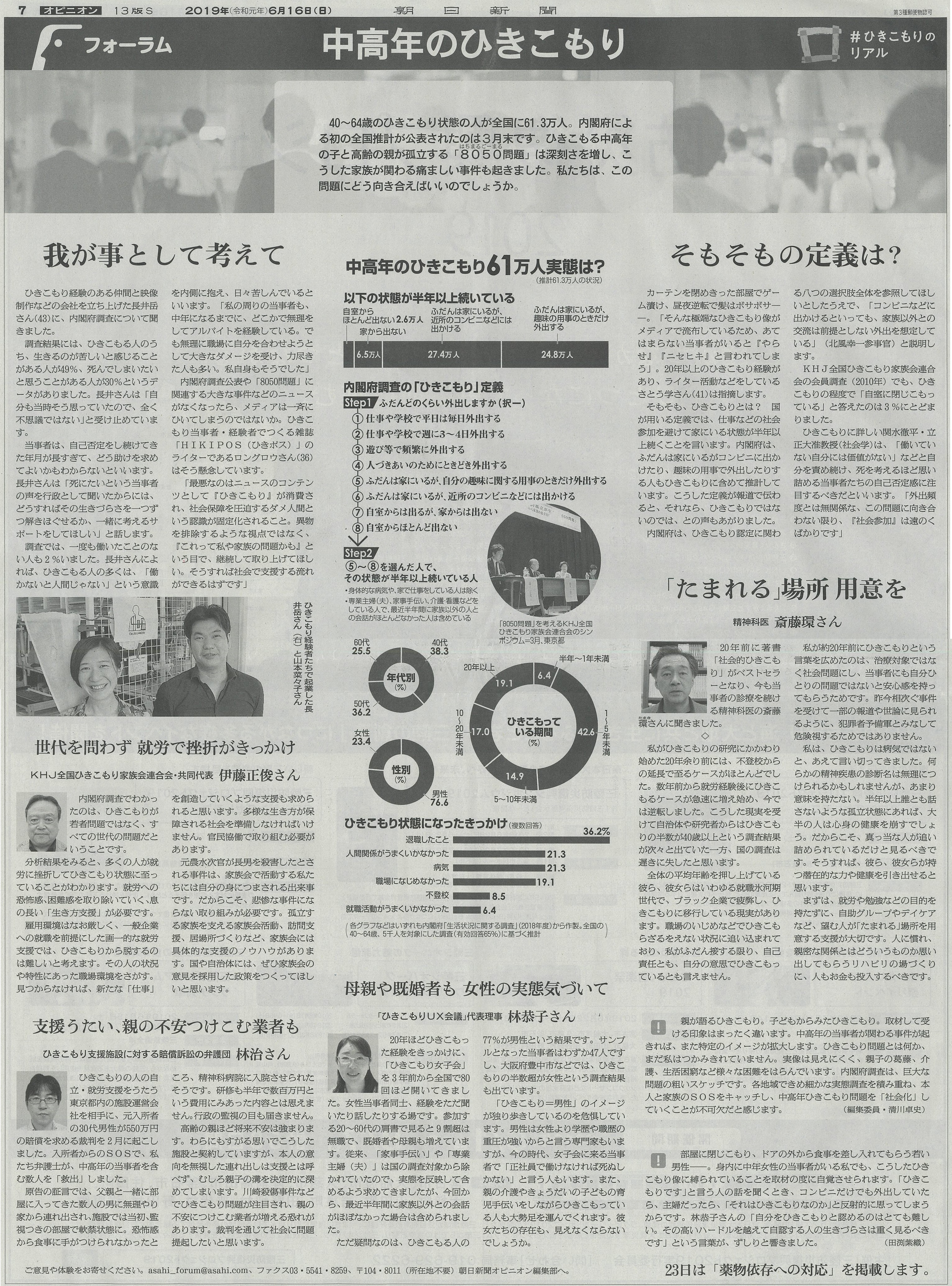 □ ひきこもりのリアル ▽朝日新聞 2019年(令和元年)6月16日(日)から ひきこもる子は47歳 このままでは共倒れ ひきこもり期間平均10年 ひきこもり専門のFPへ 福祉関連の切抜きへもどる